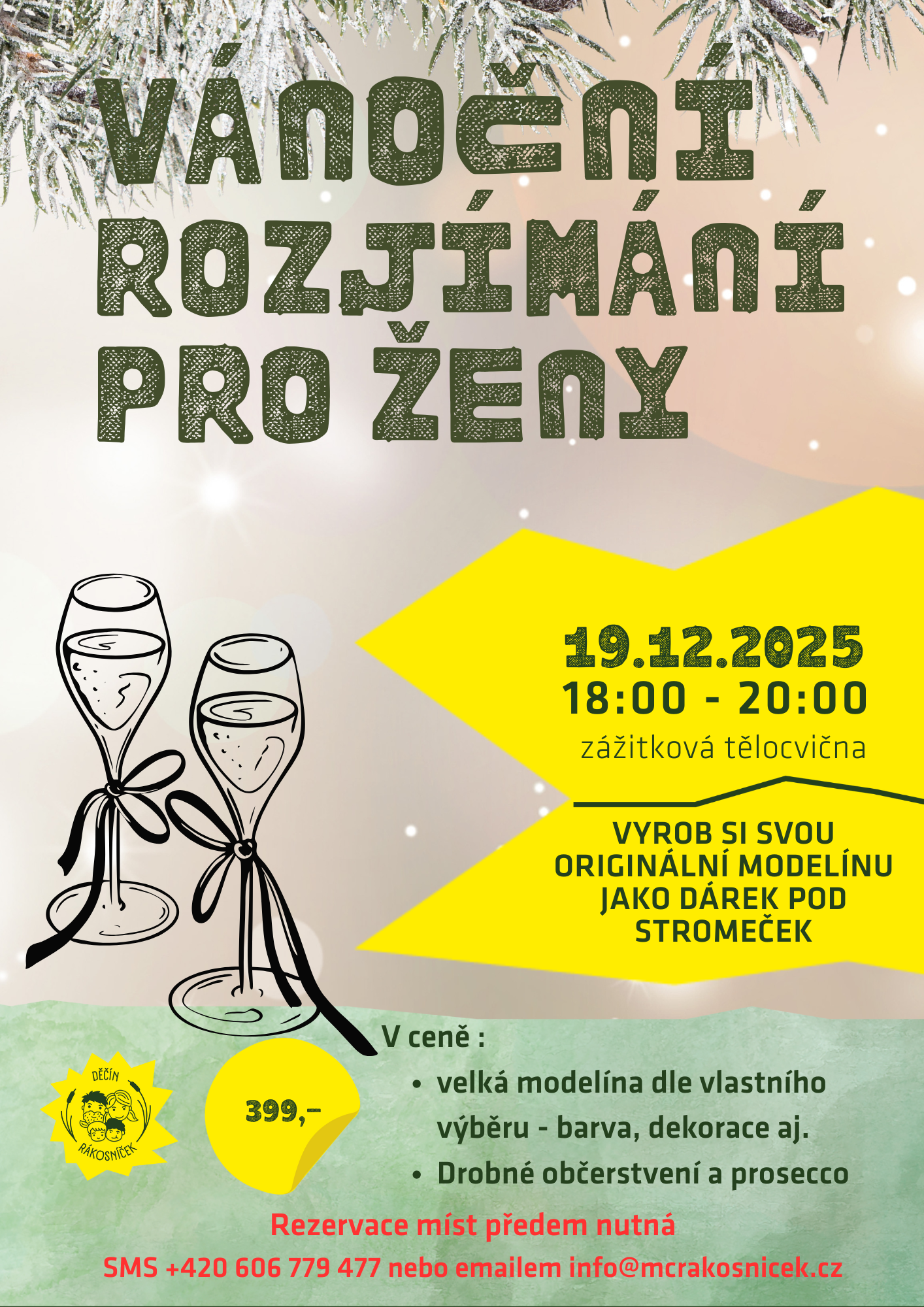 Předvánoční zastavení a chvíle pro sebe? To je páteční večer v Rákosníčku, kde nejen že vyrobíte originální dárek pod stromeček, ale vzájemně po sdílíme jak probíhají vánoční přípravy! V ceně velká 300g domácí modelína (barvy dle vlastního výběru + dekorace z 3D tisku), drobné občerstvení a prosecco. Rezervace míst předem je nutná" emailem: info@mcrakosnicek.cz mob. […]