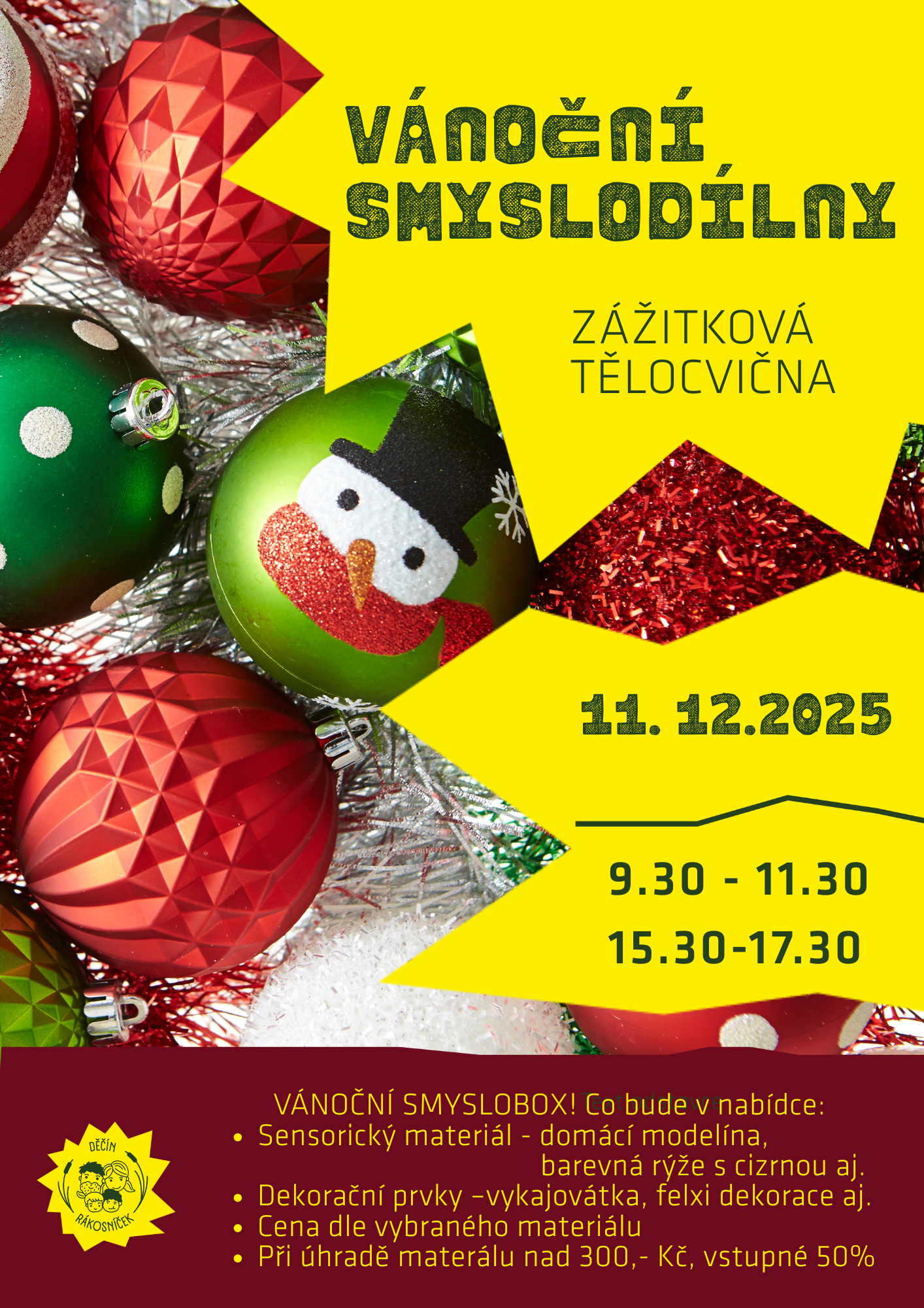 Přijďte si vyrobit vlastní voňavou domácí modelínu, doplněnou o netoxické dekorace z 3D tisku nebo vánoční smyslobox naplněný sensorickým materiálem jako je barevná rýže, cizrna aj. To vše vánočně laděné! Při úhradě materiálu nad 300,- Kč, získáte slevu na vstupném a to 50%