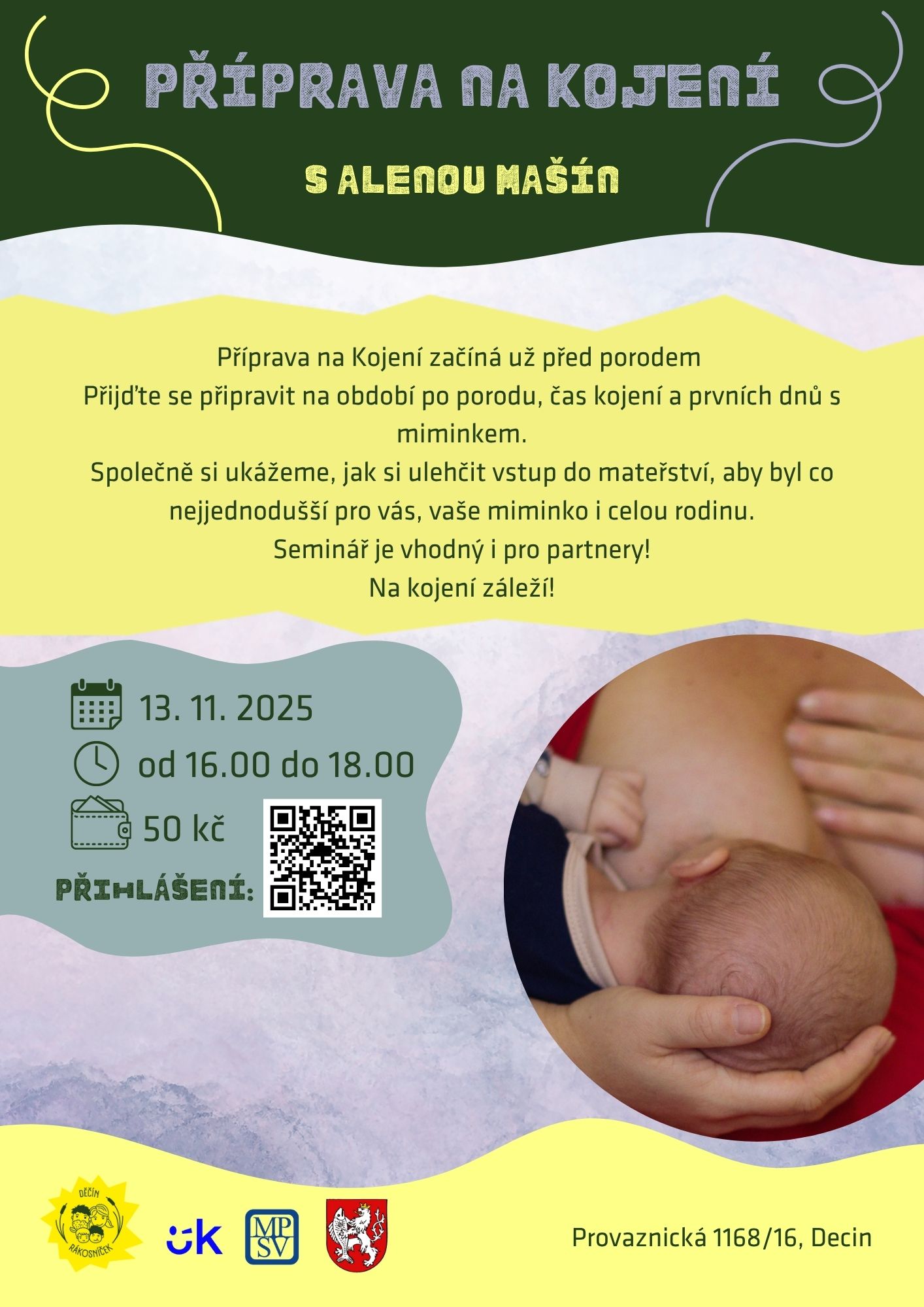 Příprava na Kojení začíná už před porodem Přijďte se připravit na období po porodu, čas kojení a prvních dnů s miminkem. Společně si ukážeme, jak si ulehčit vstup do mateřství, aby byl co nejjednodušší pro vás, vaše miminko i celou rodinu. Seminář je vhodný i pro partnery! Na kojení záleží!